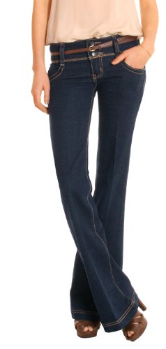 Jeans pour femme modèle évasé au niveau des jambes avec large ceinture à trois boutons. Les rivets et boutons de ce jeans bleu foncé sont de couleur sombre. Ce jeans bootcut est constitué de 95% de coton et de 5% d'élasthanne. Lavage en machine à 30°. Mesures du jeans pour femme (mesures effectuées sur un 38/M) : Entrejambe env. 85cm, longueur entrejambe-taille env. 18cm, largeur au niveau des chevilles env. 30cm, largeur au niveau des cuisses env. 25cm. Ces pantalons pour femme sont disponibles dans les tailles 34/xs, 36/s, 38/m, 40/l, 42/xl. Ce jeans pour femme bootcut est de taille standard.