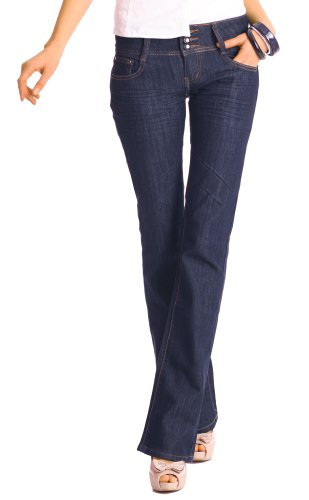 Jeans stretch pour femme de type bootcut avec une forme légèrement ample et les jambes évasées, type pattes d'éléphant. Ces jeans taille basse ont une large ceinture à trois boutons. Ce jeans bootcut cinq poches bleu foncé est composé d'une matière stretch faite de 95% de coton et de 5% d'élasthanne. Lavage en machine à 30°. Mesures (effectuées sur un 38/M) : Entrejambes env. 84cm, longueur taille-entrejambe env. 18cm, largeur à la cheville env. 21 cm. Ces jeans taille basse féminins sont disponibles dans les tailles 34/XS 36/S 38/M 40/L et 42/XL.