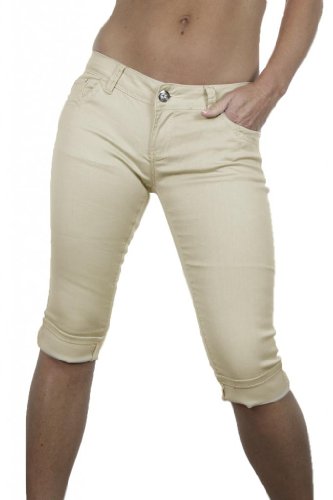 (1367-5) Pantacourt Ÿ Beige Taille Basse à Revers en Jeans Léger et Extesnble - 34